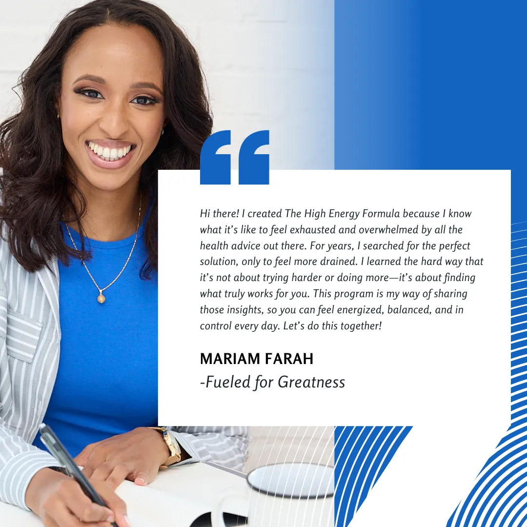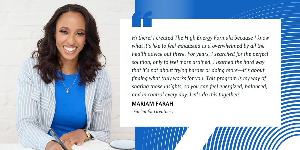 Mariam Farah, a certified nutrition and health coach with years of experience in both pharmacy and fitness. I’ve been in the shoes of my clients—drained, overwhelmed, and unsure where to turn. I spent years thinking that if I could just find the 'perfect' hack or push myself harder, I’d feel better. But what I really needed was a sustainable approach that actually fit my life.